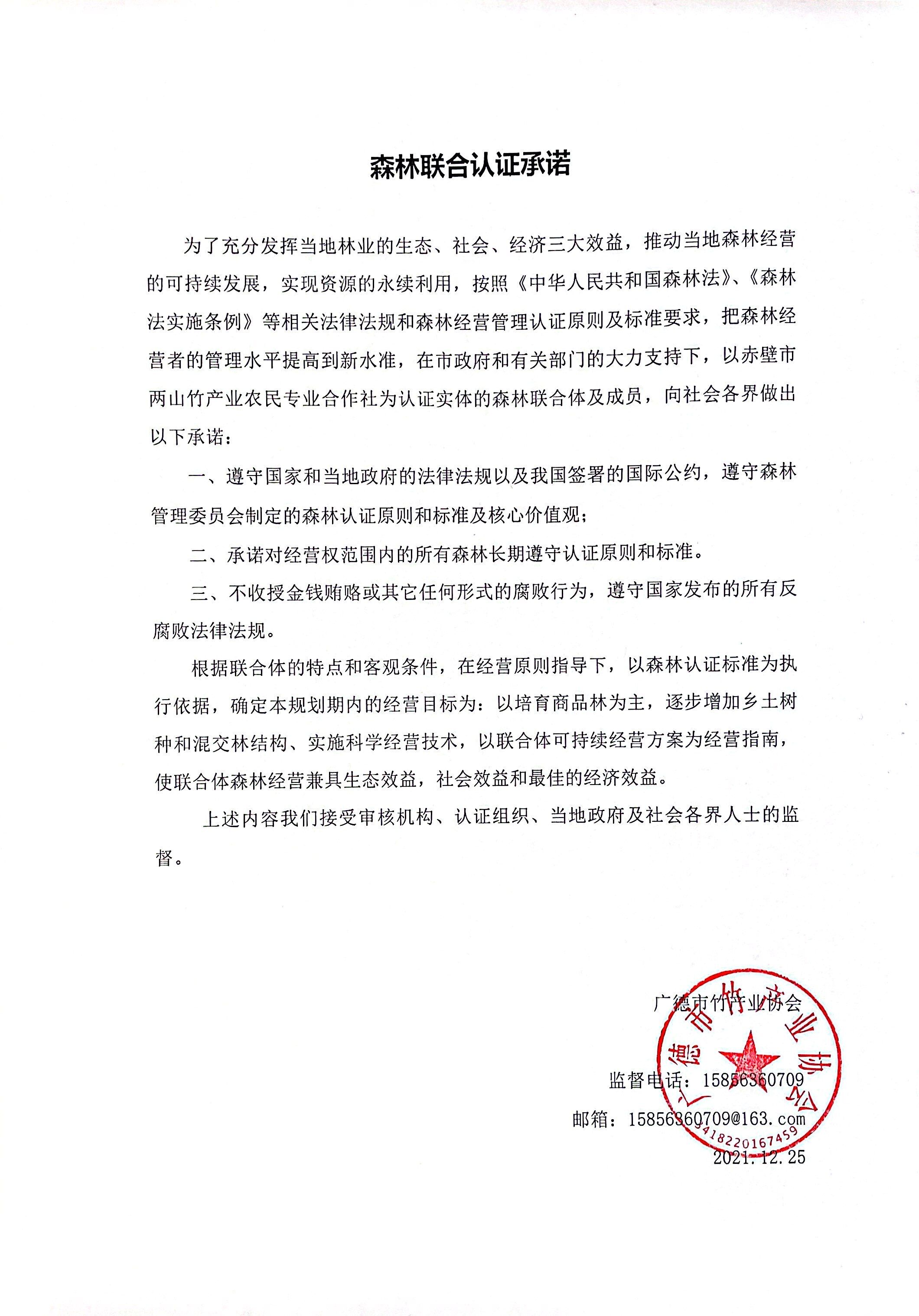 森林认证承诺书-广德市竹产业协会